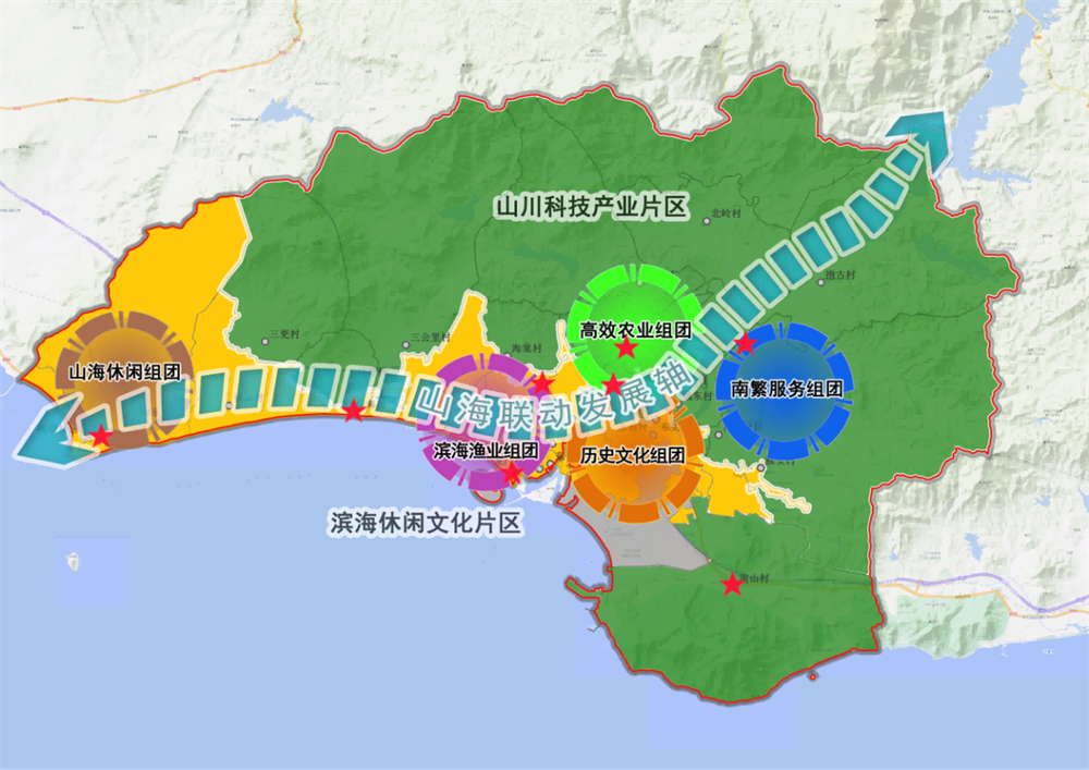 《規劃》突出片區化推進思路。根據地理空間特征、資源分布特點及鄉村發展基礎,將崖州區鄉村整體劃分為山川科技產業、濱海休閑文化兩大功能片區。整合位置相鄰、功能相近、產業相聯的村莊社區,打造南繁服務、高效農業、山海休閑、濱海漁業和歷史文化五大主題組團。各組團選擇1-2個發展基礎好、代表性突出的重點村,建設八個重要節點依托寧遠河及濱海公路聯結山海片區及組團節點,設計四條主題路線。